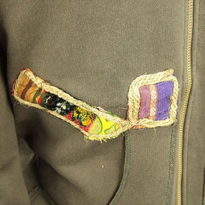 スウェットの右脇及びフード部分にはキルティングのように色々なトロピカル柄含む生地(ファブリック)が付けられており、更にJalian Tribeの証とされる、Jalian Tail(ジャリアン・テイル)がスウェット後方下部分に取り付けられています。オリジナル・モデルの場合はJalianが旅の中で海岸線に落ちている生地や鳥の羽をこれらスウェットに付けます。その意味するところは、この地球上に存在する全ての物にはすべて存在する理由があり、それらの存在を身に付けることによってシェア(共感)し、そしてそれらが持っているパワーを貰う事だと話しています。